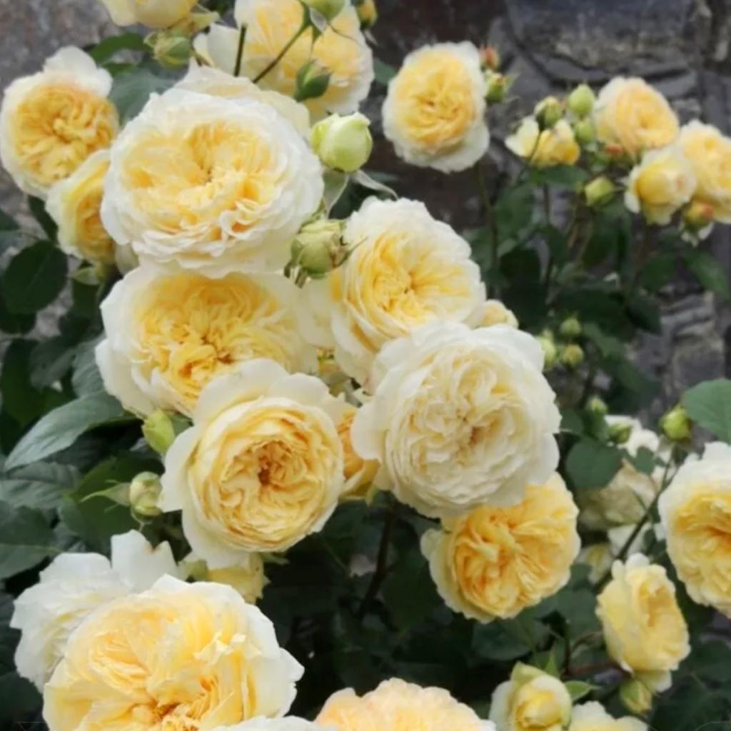 Декоративный многолетник привлекает внимание всех, кто окажется рядом с ним. Куст сильнорослый (высотой 1,2 м), хорошо разветвленный, с мощными прямыми побегами. Бутоны густомахровые, благородного желтого оттенка. Причем окрас ярче и насыщеннее ближе к центру цветка. Все бутончики собраны в соцветия-кисти, шириной 10 – 14 см. Цветение длительное (в течение всего сезона) и непрерывное. Также побеги покрыты темно-зеленой глянцевой листвой. Роза источает нежный, ненавязчивый аромат со сладкими нотками.